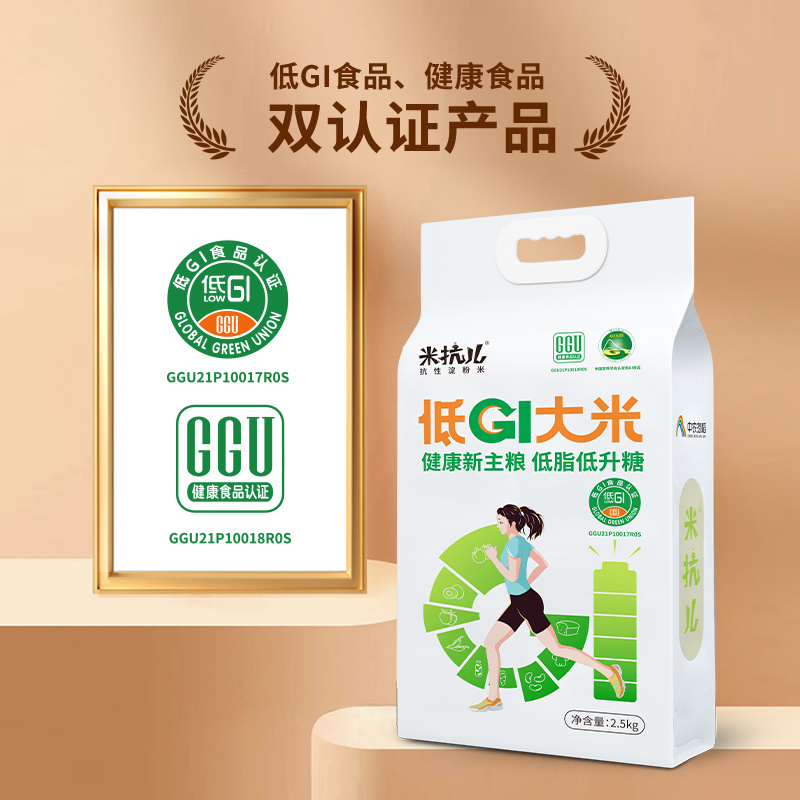 米抗兒抗性淀粉米是一款GI值為48.9、GL值為5.9、經(jīng)過健康食品、低GI食品權(quán)威認(rèn)證、獲得中國營養(yǎng)學(xué)會(huì)預(yù)包裝食品低GI標(biāo)識(shí)使用符合性證書,是一款全家人皆可食用的健康低GI大米。