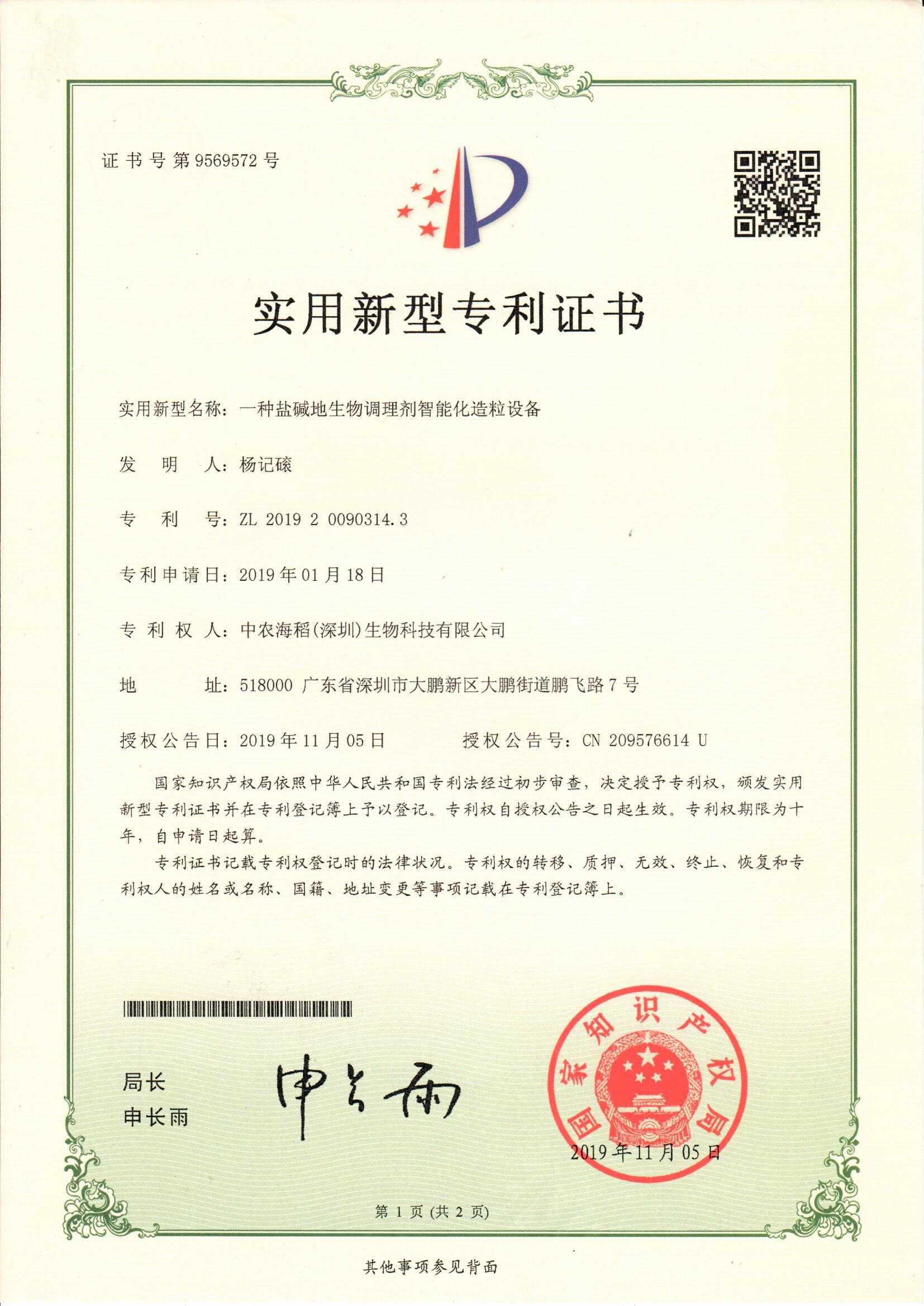 一種鹽堿地生物調(diào)理劑智能化造粒設(shè)備-證書