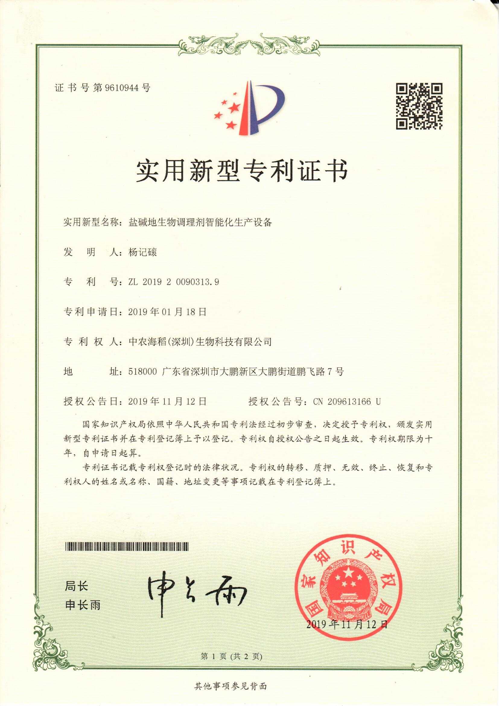 鹽堿地生物調(diào)理劑智能化生產(chǎn)設(shè)備-證書