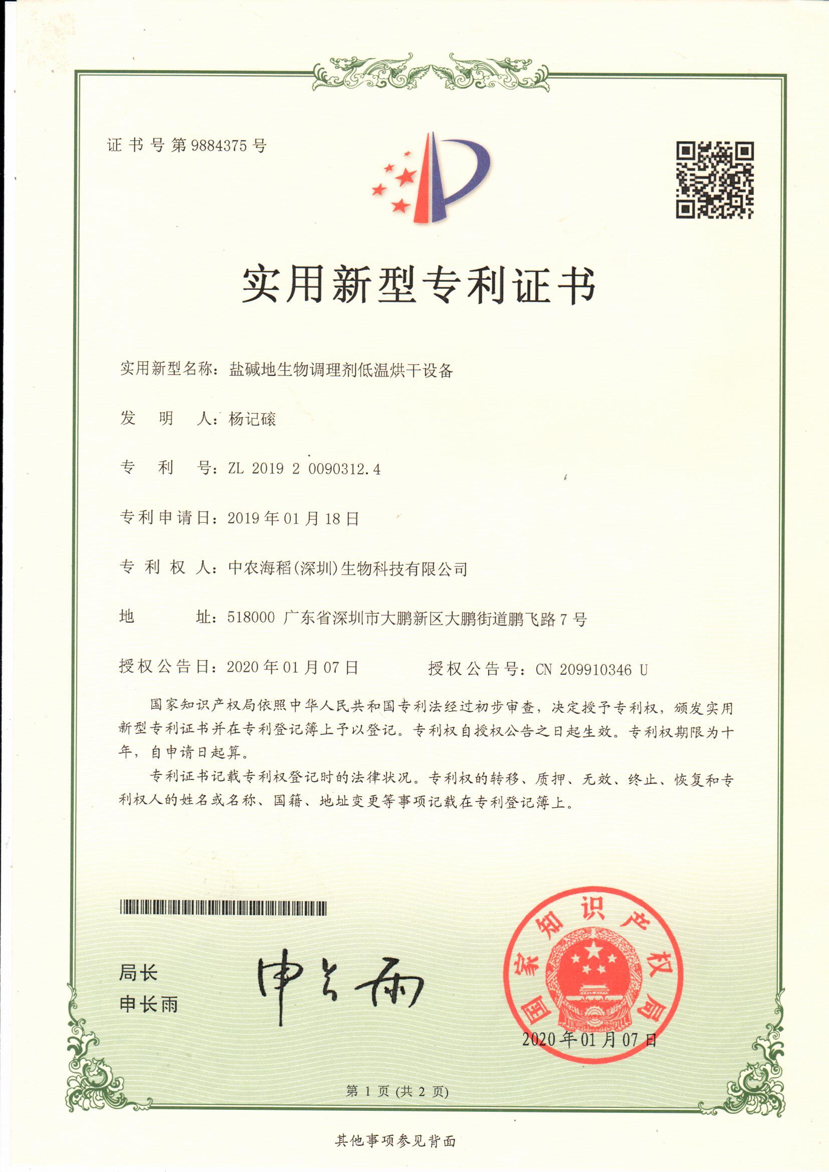 鹽堿地生物調(diào)理劑低溫烘干設(shè)備-證書