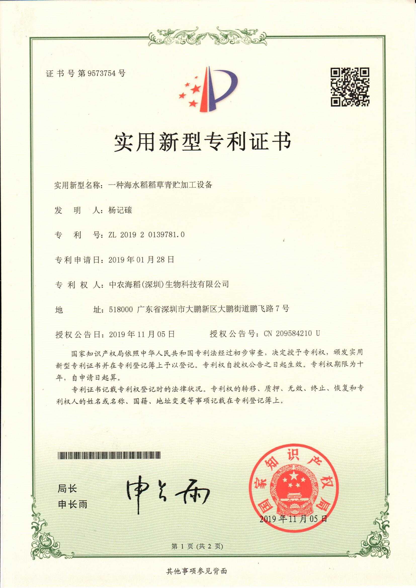 海水稻稻草青貯加工設(shè)備-證書
