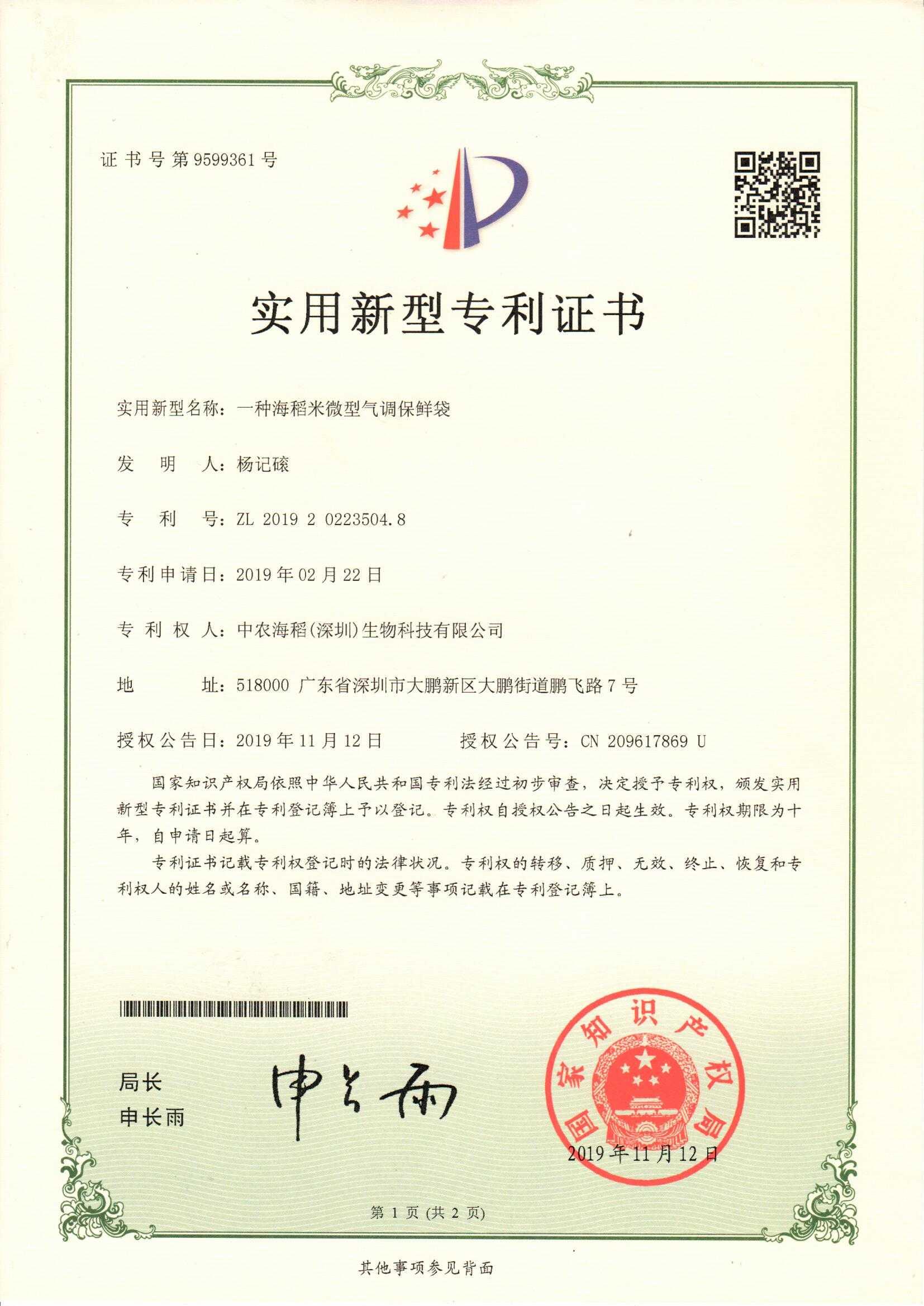 一種海稻米微型氣調(diào)保鮮袋-證書