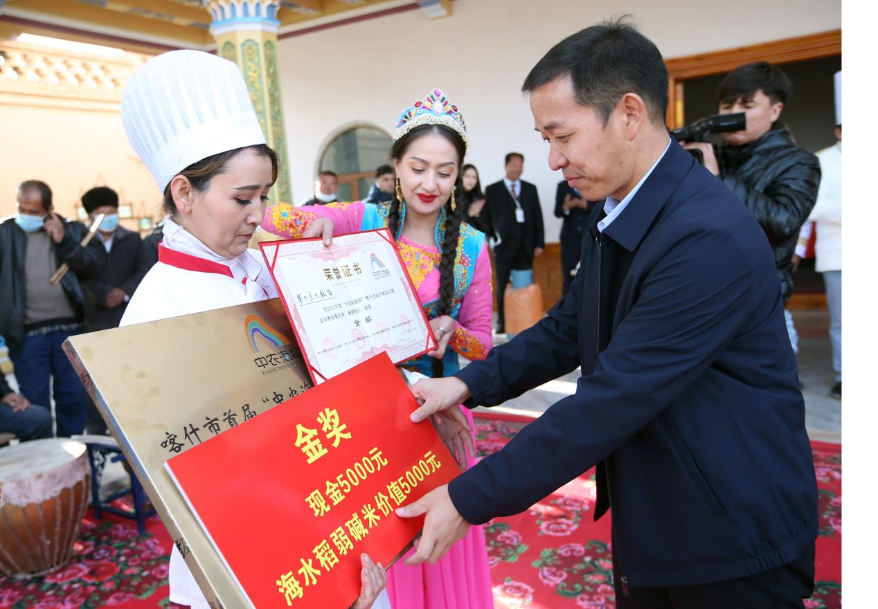 弘揚(yáng)新疆美食文化,助力鄉(xiāng)村振興,11月16日,“中農(nóng)海稻杯”首屆海水稻手抓飯決賽,在喀什帕哈太克里鄉(xiāng)稻香泉村成功舉辦。新疆喀什帕哈太克里鄉(xiāng)黨委書記李篤民、深圳援疆指揮部計(jì)劃財(cái)務(wù)處處長(zhǎng)馬力、喀什地區(qū)農(nóng)業(yè)農(nóng)村局種業(yè)發(fā)展中心副主任吐?tīng)柡榻?/span>·比克阿吉、喀什地區(qū)旅游飯店協(xié)會(huì)會(huì)長(zhǎng)李輝、喀什市文旅局喀什市文旅局產(chǎn)業(yè)中心副主任馬木提江·艾山、喀什市科學(xué)技術(shù)局辦公室主任古麗巴哈爾·阿布都熱合曼、喀什陽(yáng)光保險(xiǎn)集團(tuán)喀什分公司總經(jīng)理江顯英、新疆中農(nóng)海稻生物科技有限公司總經(jīng)理李強(qiáng)儒等人出席了本次活動(dòng)。
